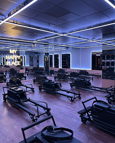 Butikskoncept för varumärket Dr. Denim. Inredning i ljus och målad plywood med schakmönstrat stengolv, Nakna glödlampor hängades i tak